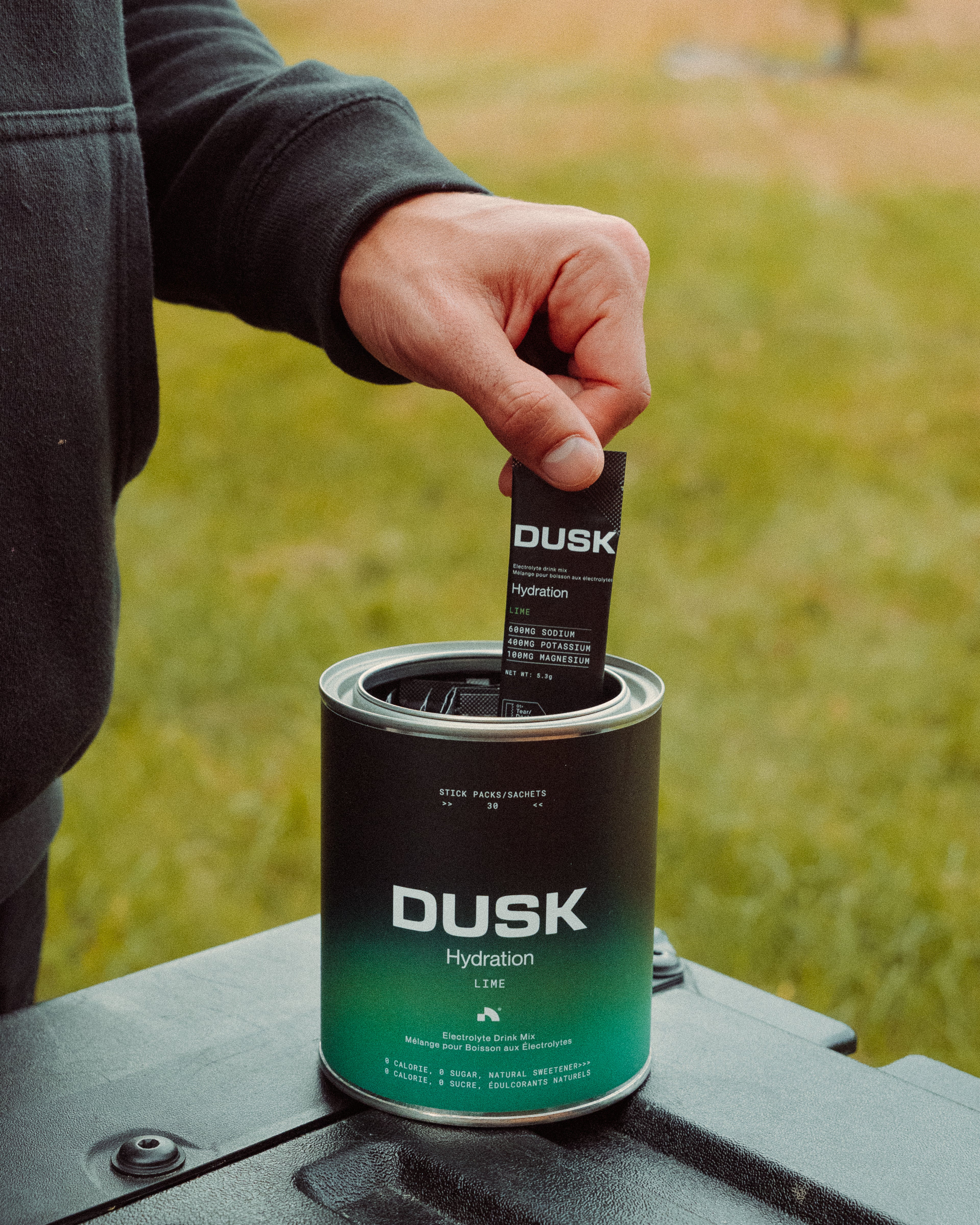 Each stick pack of DUSK Hydration contains 600mg of sodium. Sodium is an essential mineral that carries electrical charges in your body. Sodium also regulates fluid balance, which is at the core of hydration.